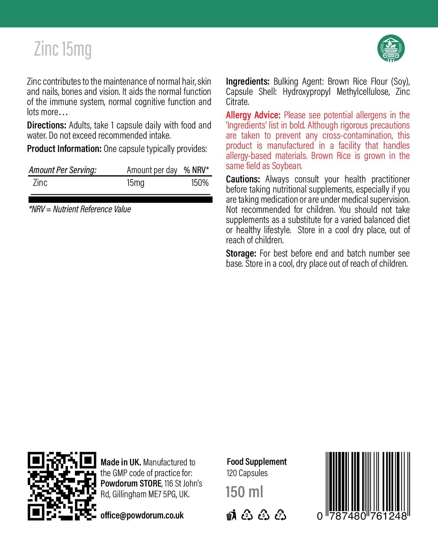 - Zinc Citrate – 15mg (150% NRV)